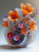 Een muurschildering als decoratieve kunst voor een stijlvol interieur. Bloemig modern stilleven gemaakt van een combinatie van natuurlijke bloemen en planten en kunstig bewerkte glazen bloemen in een stijlvol glas.