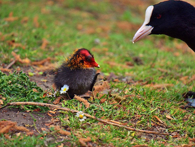 Nakomelingen van de meerkoet in het kasteelpark van Schloss Berge in Gelsenkirchen