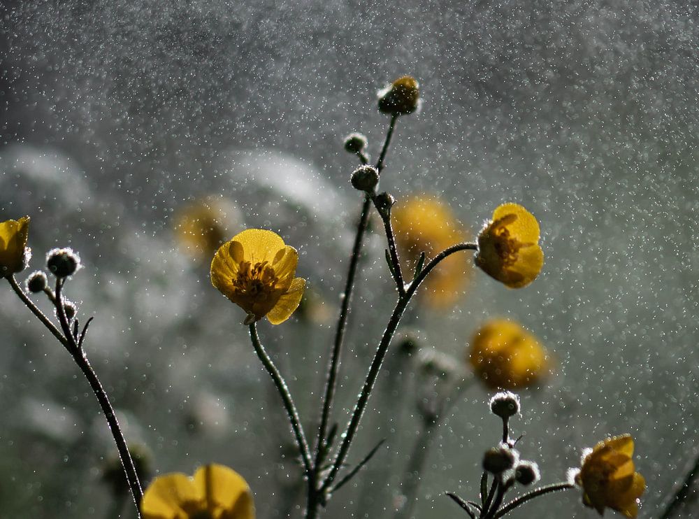 close up van een tak met boterbloemen, met een donkere moody achtergrond, en een nevel van water uit de lucht vallend