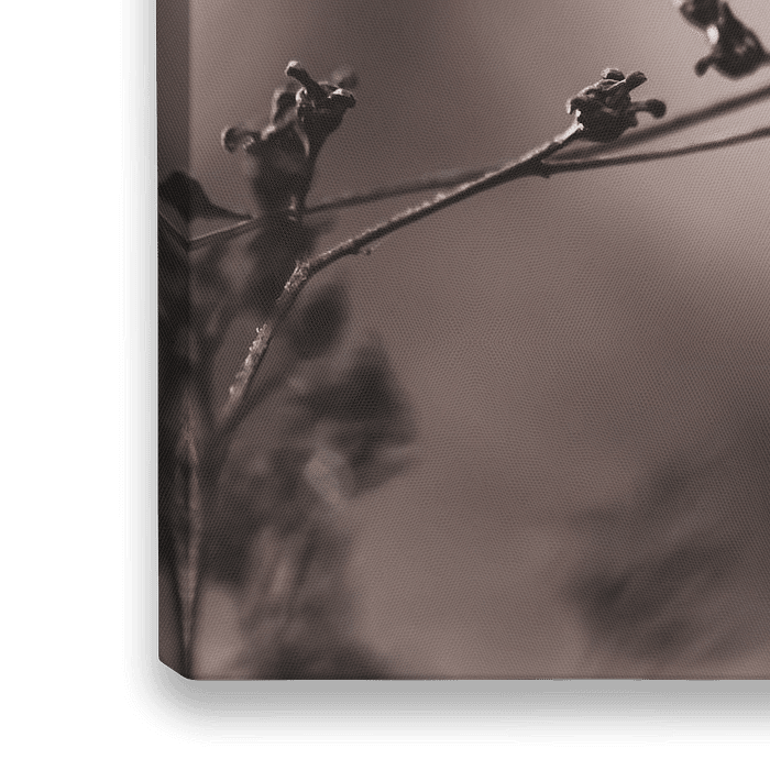 close up van een uitgebloeid hortensia blaadje, dat er heel moody uitziet, met een donkergrijze achtergrond en lichtblauwe bokeh