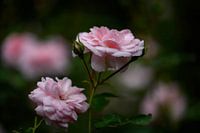 close up van twee lichtroze rozen, bedekt met dauwdruppels, met een donkere achtergrond