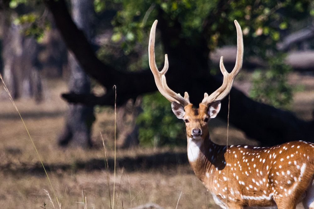 mooi gehoornde mannetjeshert of gevlekt hert, een krachtig beest Kanha National Park Madhya Pradesh, India | Kanha Tiger ...