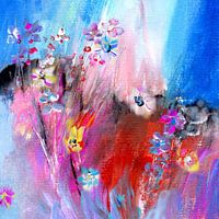 Bloemenfoto in acrylverf. Een kleurrijk en expressief beeld voor de woonkamer. Het straalt optimisme en sereniteit uit. Dominante kleuren zijn roze en blauw.