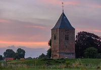 landschap in Heteren, Gelderland, langs de rivier Rijn, met de oude toren, de Peperbus, waar de lucht prachtig kleurt door de bijna opkomende zon