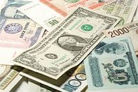 In het midden een dollarbiljet van de Verenigde Staten en op een tafel liggen bankbiljetten van over de hele wereld. De Amerikaanse dollar dient als officiële volksmunt in vele landen buiten Amerika.