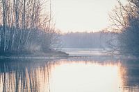 een van de meren van de Kuilen bij Langenboom, waar een mystieke sfeer heerst door de opkomende zon