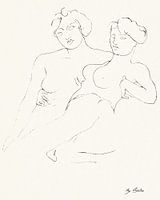vintage illustratie. Twee figuren, meiden liggen naakt bijeen. De ene vrouw is topless en ligt met een tiet op het kunstwerk, een tekening of schets. De andere meid ligt met beide borsten bloot op de illustratie, een naaktportret.