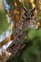 Ransuil ( Asio otus ) in zijn schuilplaats overdag in een naaldboom.
