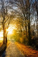Laat in de herfst, landweggetje in het licht van de rijzende zon