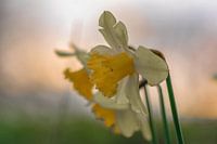 close up van drie gele narcissen in het gras, in het gouden licht van de vroege ochtend
