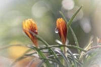 close up van twee oranje krokussen, waar de regendruppels op zitten, met een kleurige zonnige achtergrond met bokeh