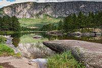 Nationaal natuur park in Noorwegen met reflectie van de bergen in het water en het groene bos als achtergrond