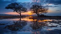 Twee majestueuze bomen staan aan de waterkant, weerspiegeld in het kalme water tijdens het blauwe uurtje. De lucht heeft een betoverende blauwe tint, en de contouren van de bomen worden zacht verlicht. De reflectie op het water creëert een sprookjesachtig tafereel, waarin de natuur zichzelf lijkt te omarmen in een harmonieus en…
