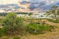 Een zomers beeld van het natuurgebied de Schoorlse Duinen in Noord-Holland. Donkere wolken trekken over het prachtige duinlandschap. Hier zicht op het duin en de naaldbomen.