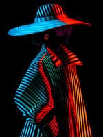 In dit betoverende schilderij van Laurie Simmons komt een neonvrouw tot leven met een unieke fusie van neonkleuren en de kenmerkende stijl van Fornasetti. De vrouw draagt een indrukwekkende neonkleurige rotan hoed en jas, waardoor ze oplicht als een stralend kunstwerk. De neonkleuren, variërend van levendig roze en elektrisch blauw tot…