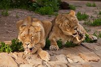 Koop dit leeuwen kunstwerk nette leeuwinnen likken er zes, wassen in rode tongen. Twee leeuwenvriendinnen zijn grote mooie katt van Michael Semenov als print op canvas, aluminium dibond, (ingelijste) fotoprint, behang en ArtFrame. Voor jou op maat geprint in Fine-Art kwaliteit.