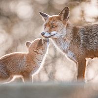 een jonge vos staat neus aan neus met haar moeder