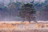 grote boom die uitsteekt boven de nevel die over de heide hangt
