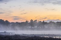 landschap op de Hatertse en Overasseltse vennen, met nevel over het water en een oranje lucht door de bijna opkomende zon