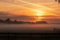 zicht over een weiland waar de ochtendnevel over hangt, met een prachtige oranje lucht net voor de zon opkomt
