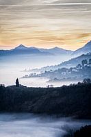Dit is bij het plaatsje Castelplanio in de regio Le Marche in Italie, de nevel blijft tussen de bergen hangen en met een zonsondergang geeft dat een mooi effect.