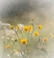 close up van een tak met wilde boterbloemen, waar een nevel van water overheen komt, in het licht van de lentezon