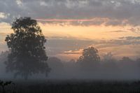 landschap op de Wolfhezerheide in Gelderland, vroeg in de ochtend, met mist en prachtige wolken en een bijna opkomende zon