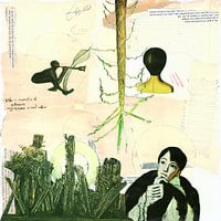vierkante collage op lichtbeige papieren, voornamelijk schutbladen van oude boeken, vanaf de bovenkant in het midden een soort bamboestengel die op de kop hangt, met links daarvan een zittend donkergroen figuurtje dat op een langgerekt instrument blaast, met uiterst links een reep tekst die de titel bevat, rechts van de stengel een op de rug gezien borstbeeld (hoofd zwart, nek en schouders lichtgroen) met rechts daarvan een rood stempel "afgeschreven bibliotheek Rijswijk" met daarboven een reep cursieve tekst op de kop, op de onderste rand een peinzende vrouwenfiguur, met links daarvan abstracte donkergroene groeisels