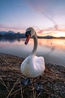 nieuwsgierige zwaan aan de Hopfensee bij zonsondergang