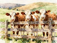 Vier bruin-witte koeien richten hun rustige, alerte blik nieuwsgierig naar voren. De aquarel geeft de scène een lichte, bijna zwevende sfeer – kleuren lopen in elkaar over, contouren blijven zacht en levendig. De compositie oogt evenwichtig en toegankelijk: landelijke idylle, stille nieuwsgierigheid en een moment van rustige…