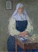 Dit nonnetje staat hier op een portret. De strenge vrouw uit de Rooms Katholiek, christelijke traditie zit aan een tafel in al haar eenvoud met een blauw schort.