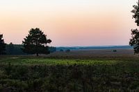 vergezicht op de Hoge Veluwe, bij zonsopkomst, waardoor de lucht mooi oranje kleurt