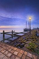 zonsopkomst in Volendam gezien vanaf de ingang van de haven met een reiger op een meerpaal en een historische zeilboot aan de kade