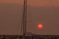 De zon na zonsopgang bloedrood aan de hemel achter een zeilschip