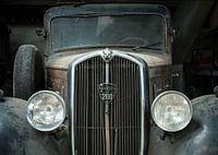 oldtimer uit een garage waar meerdere auto's in vervallen staat zijn