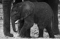 jonge olifant die bescherming zoekt bij zijn moeder. gefotografeerd in botswana, chobe, en uitgevoerd in zwart wit
