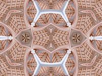 Een fascinerend patroon dat fascineert door de symmetrische en gedetailleerde structuur. Het is een abstracte voorstelling van een gewelfd plafond in een architecturaal ontwerp, waarbij geometrische vormen centraal staan. De belangrijkste motieven van de afbeelding zijn ruitvormige en rechthoekige oppervlakken in warme beige en bruine…