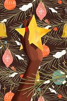 Een feestelijke, moderne kerstafbeelding met een hand met rode nagellak die een grote gele ster in een kerstboom plaatst, omringd door diverse ornamenten en dennentakken. De stijl is modern, illustratief en kleurrijk, met…