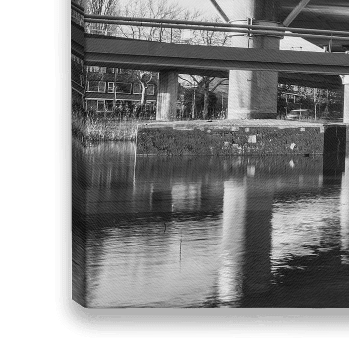 Deze zwart-wit foto toont de imposante infrastructuur van viaducten en snelwegen in Rotterdam. De gebogen lijnen in dit werk voeren de boventoon, maar ook het lijnenspel in de reflectie van het water heeft een kunstzinnig effect op het beeld. Samen vormt het een indrukkend gevoel van schaal en krachtige, industriële uitstraling.