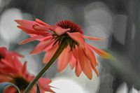 close up van de onderkant van een oranje echinecea, ofwel zonnehoed, met een grijze bokeh achtergrond
