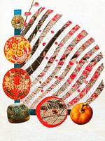 staande collage die doet denken aan een zeilboot mast en schip gevormd door een zwarte L, met daarop cirkelvormige afbeeldingen met oosterse motieven het zeil gevormd door golvende stroken van een afbeelding met rode bloesem, met de tekst tussen de stroken geschreven