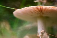 close up van een paddenstoel gefotografeerd van de onderkant, met een zachte wazige achtergrond