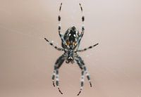 close up van de onderkant van een kruisspin die ondersteboven in zijn web hangt