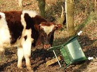 ... een vriendelijke boer had deze kruiwagen met hooi neer gezet , maar het ondeugende kalf gooide het om...