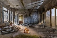 De hal van een schoolgebouw in de buurt van Tsjernobyl, 33 jaar na de ramp