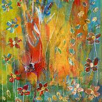 Bloemenbeeld in acrylverf en grafische elementen. Een kleurrijk en expressief bloemenbeeld voor in huis. Het straalt optimisme en vrolijkheid uit. De schoonheid van de natuur biedt altijd een onuitputtelijke bron van inspiratie. Bloemenfantasieën worden kunstzinnig in scène gezet... Bloemen, bloesems, bladeren
