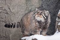 op de achtergrond van de klif. Ernstige, wrede, pluizige, wilde kattenmanoeuvre op witte sneeuw.