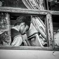 zwart-wit straatfotografie van jongen op een oude bus die wacht op het vertrek