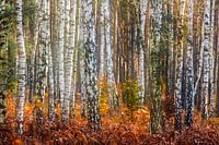 een koele ochtend, berkenbos in de herfst, het zonlicht laat de herfstkleuren schijnen, aan de rand van een natuurreservaat op de Dübener Heide wordt de betoverende sfeer versterkt door een dubbele belichting.