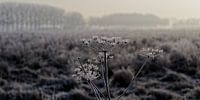 Rijp, koud en grijs. De zon is net op en belicht de plant van achteren.